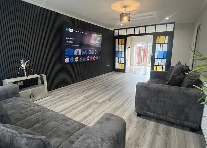 Die Stylish Family Home With Cinema-Style Lounge Near Blackpool verfügt über eine komplette Küche mit einem Wasserkocher, einem Kühlschrank und einem Herd für die Selbstversorgung. Das Restaurant Level 6, die eine große Auswahl an Gerichten bietet, ist ungefähr 7 Fußminuten von hier entfernt. Der Flughafen Blackpool ist in nur 20 Autominuten zu erreichen.